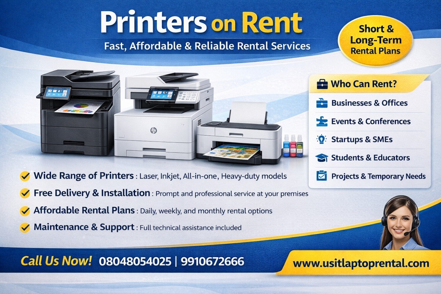 Printers on Rent | Affordable, Reliable & High-Quality Printing Solutions Looking for printers on rent for office, corporate, events, or short-term projects? US IT Services offers high-performance printer rental solutions that are cost-effective, flexible, and fully supported. Whether you need a single printer or bulk printer rental, we provide latest branded printers on rent with fast delivery, installation, and technical supportβ€”so your work never stops. πŸ“ž Call Now: 08048054025, 9910672666 🌐 Website: www.usitlaptoprental.com ⭐ Why Choose US IT Services for Printer Rental? US IT Services is a trusted provider of printer rental services for businesses, corporates, institutions, and events. βœ… Flexible Rental Plans Daily, weekly, monthly, and long-term printer on rent options. βœ… Branded & Latest Printers HP, Canon, Brother, Epson, Ricoh, Samsung & more. βœ… Fast Delivery & Installation Quick setup at your office, site, or event location. βœ… Complete Technical Support Maintenance, troubleshooting, and replacement included. βœ… Cost-Effective Solutions No heavy investment, no repair worries. πŸ–¨οΈ Printers Available on Rent πŸ”Ή Laser Printers on Rent Ideal for offices with high-volume black & white printing needs. πŸ”Ή Color Printers on Rent Perfect for presentations, marketing material, and graphics printing. πŸ”Ή Multifunction Printers (MFP) on Rent Print, scan, copy, and faxβ€”best for corporate and office use. πŸ”Ή Inkjet Printers on Rent Suitable for home offices, students, and small businesses. πŸ”Ή Network Printers on Rent Centralized printing solutions for teams and enterprises. πŸ”Ή Heavy-Duty & Commercial Printers High-speed printers for bulk printing and professional use. 🏒 Ideal For Corporate offices Startups & SMEs Training institutes & schools Events, exhibitions & conferences Construction & project sites Temporary offices Home offices & students ⭐ Benefits of Renting Printers No upfront purchase cost Easy upgrade anytime Zero maintenance hassle Scalable as per workload Ideal for short-term & long-term use πŸ“ž Get Printers on Rent Today Get reliable, high-quality printers on rent with fast delivery, affordable pricing, and complete support from US IT Services. πŸ“ž Call Now: 08048054025, 9910672666 🌐 Visit: www.usitlaptoprental.com